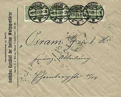 Inland cover with registeration (1-20 g) from 30.10.1923 (21. Period) franked with 5 stamps a 4 Million Mark (=20 Million Mark, 10 Million cover 10 Million registeration) |