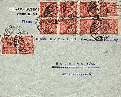 Inland cover (1-20 g) from 02.11.1923 (22. Period) franked with 10 stamps a 10 Million Mark (=100 Million Mark)