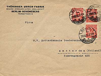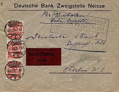 Inland cover with special delivery (1-20 g) from 24.10.1923 (21. Period) franked with 3 stamps a 10 Million Mark (=30 Million Mark, 10 Million cover 20 Million special delivery)