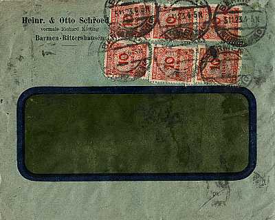 Local cover (1-20 g) from 05.11.1923 (23. Period) franked with 50 stamps a 10 Million Mark (=500 Million Mark)