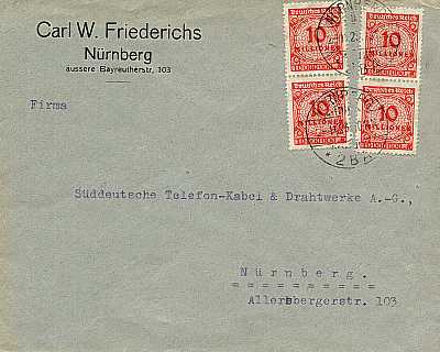 Local cover (1-20 g) from 02.11.1923 (22. Period) franked with 4 stamps a 10 Million Mark (=40 Million Mark)