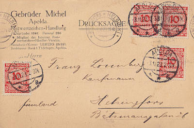 Inland printed matter (1-25 g) from 03.11.1923 (22. Period) franked with 2 stamps a 10 Million Mark (=20 Million Mark)