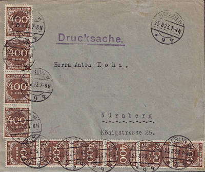 Inland printed matter (1-25 g) from 25.08.1923 (16. Period) franked with 10 stamps a 400 Mark (=4 000 Mark)