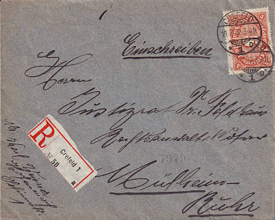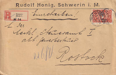 Inland cover with registeration (21-100 g) from 21.03.1922 (7. Period) franked with one stamp a 5 Mark (=5 Mark, 3 cover 2 registeration) |