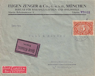 Inland cover with special delivery (1-20 g) from 20.06.1922 (7. Period) franked with one stamp a 5 Mark (=5 Mark, 2 cover 3 special delivery) |