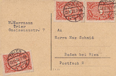 Foreign postcard from 27.12.1922 (11. Period) franked with 3 stamps a 5 Mark (=15 Mark); to Austria the inland fee was valid |
