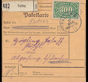 Inland parcel card (1 000 g, < 75 km) from 17.03.1923 (12. Period) franked with one stamp a 300 Mark (=300 Mark) |