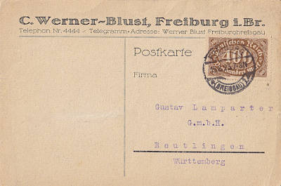 Inland postcard from 15.08.1923 (15. Period) franked with one stamp a 400 Mark (=400 Mark) |