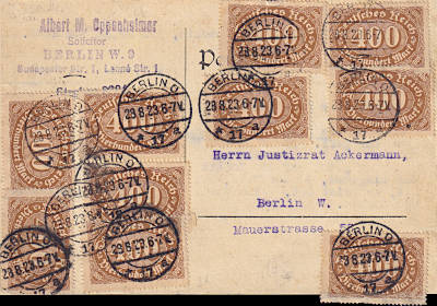 Inland cover with registeration (1-20 g) from 23.08.1923 (15. Period) franked with 5 stamps a 400 Mark (=2 000 Mark, 1 000 cover 1 000 registeration) |