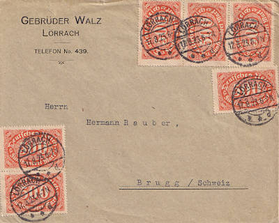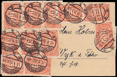 Auslandsbrief (1-20 g) vom 17.08.1923 (15. Periode) frankiert mit 6 Marken a 500 Mark (=3 000 Mark) |