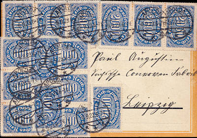 Inland postcard from 06.09.1923 (17. Period) franked with 15 stamps a 2 000 Mark (=30 000 Mark) |
