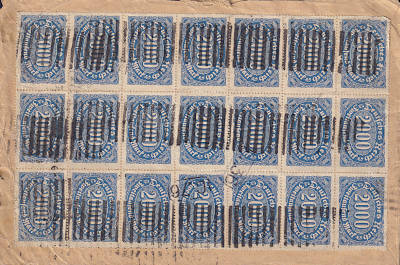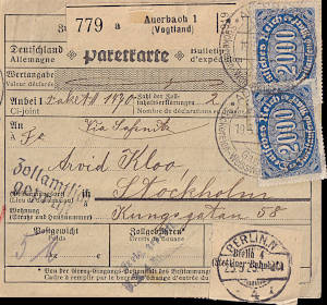 Foreign parcel card (5 000 g) from 19.05.1923 (13. Period) franked with 12 stamps a 2 000 Mark (=24 000 Mark) |