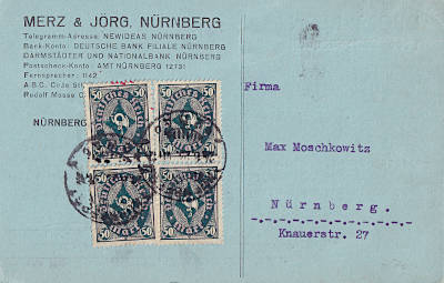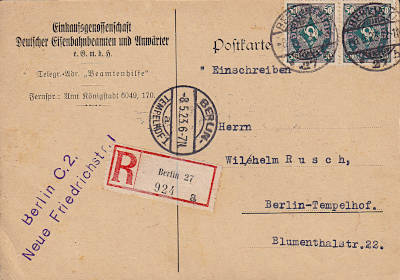 Local postcard with registeration from 03.03.1923 (13. Period) franked with 2 stamps a 50 Mark (=100 Mark, 20 postcard 80 registeration)