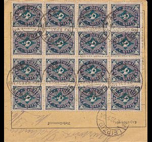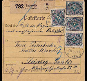 Inland parcel card (4 500 g, > 75 km) from 25.06.1923 (13. Period) franked with 20 stamps a 50 Mark (=1 000 Mark)