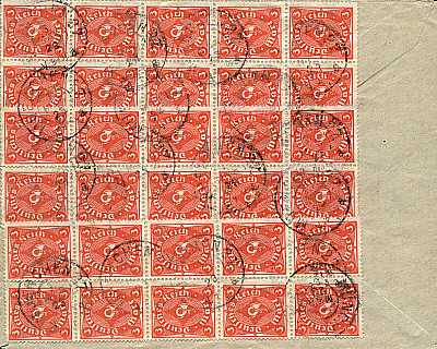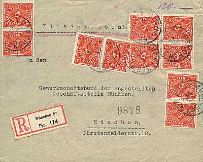 Local cover with registeration (1-20 g) from 03.03.1923 (13. Period) franked with 40 stamps a 3 Mark (=120 Mark, 40 cover 80 registeration)