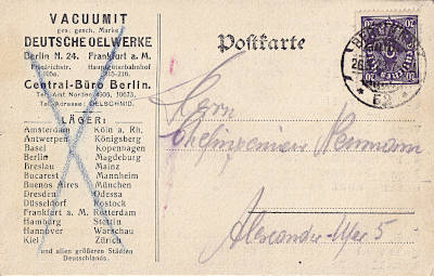 Ortspostkarte vom 26.03.1923 (13. Periode) frankiert mit einer Marke a 20 Mark (=20 Mark) |
