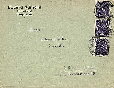 Ortsbrief (21-100 g) vom 28.05.1923 (13. Periode) frankiert mit 3 Marken a 20 Mark (=60 Mark) |
