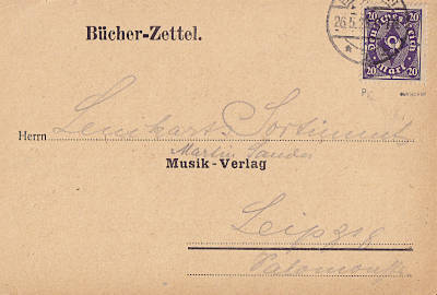 Inlandsbücherzettel (1-25 g) vom 26.05.1923 (13. Periode) frankiert mit einer Marke a 20 Mark (=20 Mark) |