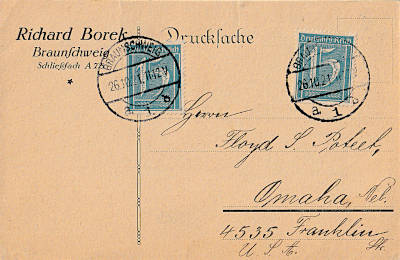 Foreign printed matter (1-50 g) from 26.10.1921 (6. Period) franked with 2 stamps a 15 Pfennig (=30 Pfennig)