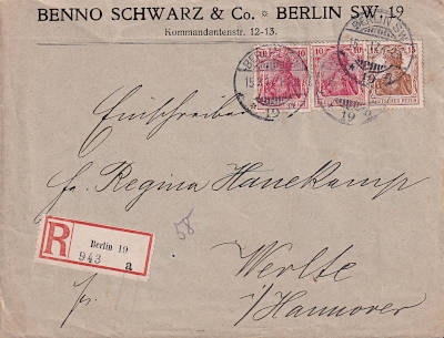 Inlandsbrief mit Einschreiben (1-20 g) vom 15.03.1917 frankiert mit 3 Marken (=35 Pfennig, 15 Brief 20 Einschreiben)
