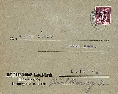 Inland cover (1-20 g) from 01.10.1919 franked with 10 stamps a 2 Pfennig (=20 Pfennig) |