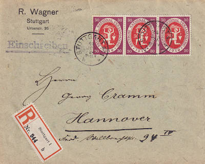 Inland parcel card with registeration (7 000 g, > 75 km) from 16.09.1920 franked with 3 stamps a 1½ Mark (=4,50 Mark, 4 parcel 0,50 registeration) |