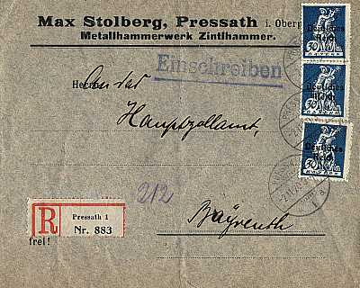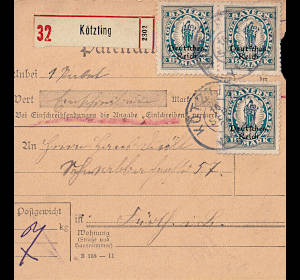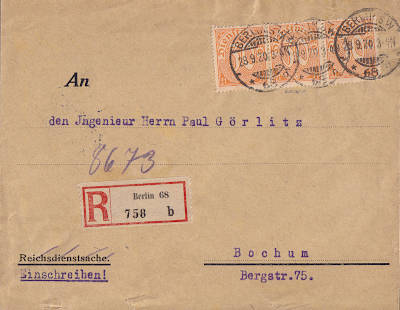 Inland parcel card with registeration (12 000 g, > 75 km) from 20.07.1920 franked with 4 stamps (=8,50 Mark, 8 parcel 0,50 registeration) |