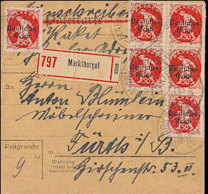 Inland parcel card with registeration (9 000 g, < 75 km) from 18.05.1920 franked with 6 stamps a 50 Pfennig (=3 Mark, 2,50 parcel 0,50 registeration) |