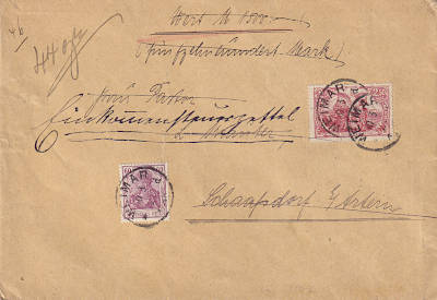 Inland parcel card with value (1 500 Mark) (2 910 g, > 75 km) from 25.11.1920 franked with 13 stamps a 50 Pfennig (=6,50 Mark, 2 parcel 0,50 registeration 4 value) |