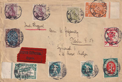 Inland cover with special delivery and airmail (101-250 g) from 09.03.1921 franked with 10 stamps (=4 Mark, 0,60 cover 1 special delivery 2,40 airmail) |