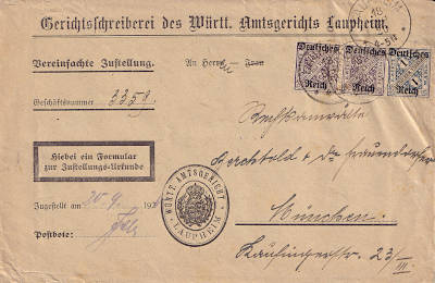 Inland cover with affidavit of service (1-20 g) from 18.09.1920 franked with 3 stamps (=1,30 Mark, 0,40 cover 0,50 delivery 0,40 document)