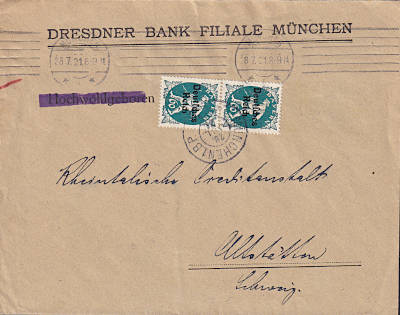 Foreign cover (1-20 g) from 28.07.1921 franked with 2 stamps a 60 Pfennig (=1,20 Mark) |