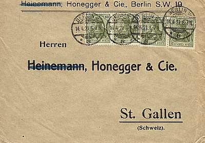 Foreign cover (41-60 g) from 14.04.1921 franked with 4 stamps a 60 Pfennig (=2,40 Mark) |