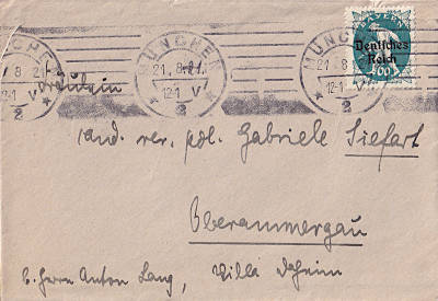 Inland cover (1-20 g) from 28.05.1921 franked with 3 stamps a 20 Pfennig (=60 Pfennig) |