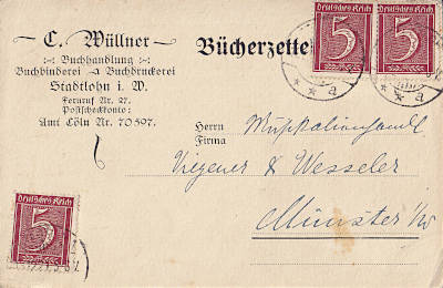 Inland book order (1-50 g) from 13.12.1921 franked with 3 stamps a 5 Pfennig(=15 Pfennig)