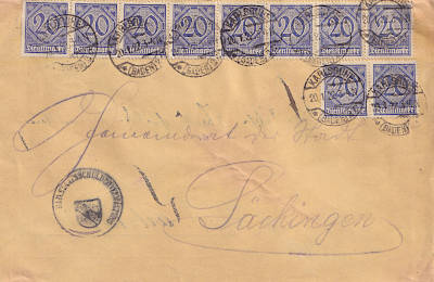 Inland cover (1-20 g) from 23.05.1922 franked with 10 stamps a 20 Pfennig (=2 Mark) |