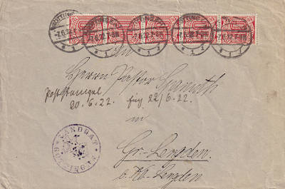 Inland cover (1-20 g) from 23.06.1922 franked with 5 stamps a 40 Pfennig (=2 Mark) |