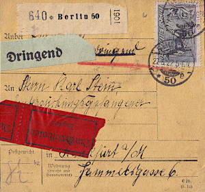 Inland cover with special delivery (1-20 g) from 22.04.1922 franked with 2 stamps a 2½ Mark (=5 Mark, 2 cover 3 special delivery) |