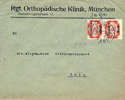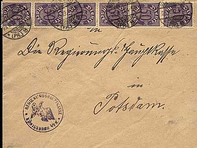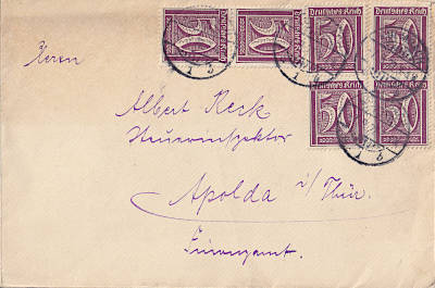 Inland cover (1-20 g) from 25.08.1922 franked with 6 stamps a 50 Pfennig (=3 Mark) |