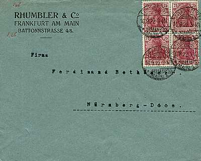 Inland cover (1-20 g) from 16.09.1922 franked with 4 stamps a 75 Pfennig (=3 Mark) |