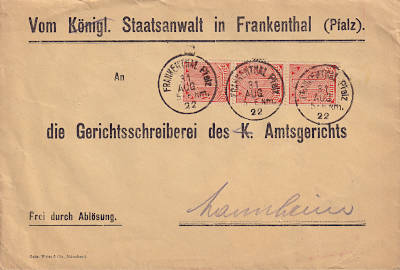 Inland cover (1-20 g) from 31.08.1922 franked with 3 stamps a 1 Mark (=3 Mark) |