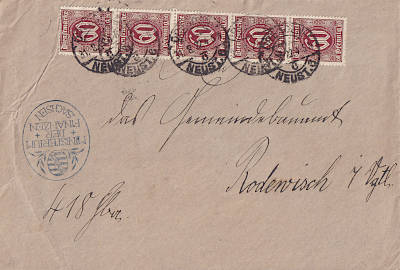 Inland cover (1-20 g) from 31.08.1922 franked with 5 stamps a 60 Pfennig (=3 Mark) |