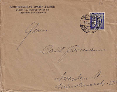 Inland printed matter (501-1 000 g) from 08.08.1922 franked with 2 stamps a 2,50 Mark (=5 Mark) |