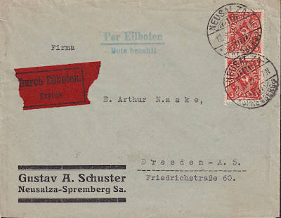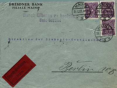 Inland cover with special delivery (1-20 g) from 20.07.1922 franked with 3 stamps a 2 Mark (=6 Mark, 3 cover 3 special delivery) |