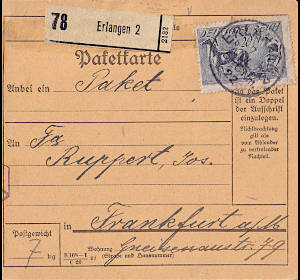 Inlandspaketkarte (4 500 g, > 75 km) vom 04.09.1922 frankiert mit 14 Marken a 1 Mark (=14 Mark) |