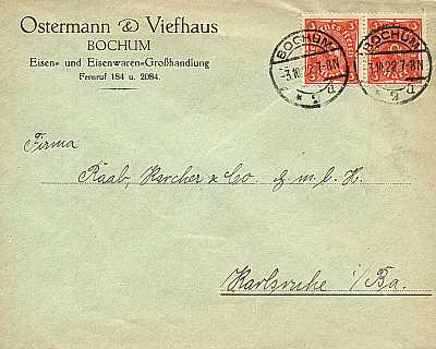 Inland cover (1-20 g) from 03.10.1922 franked with 2 stamps a 3 Mark (=6 Mark) |
