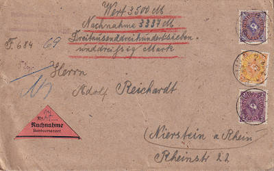 Inland cover with value (3 500 Mark) and cash on delivery (52 g) from 07.11.1922 franked with 3 stamps (=27 Mark, 8 cover 4 registeration 12 value 3 cash on delivery) |