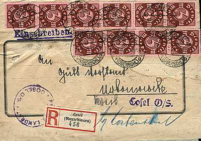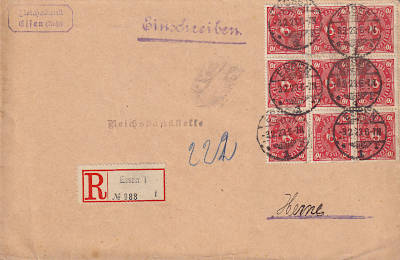 Inland cover with registeration (1-20 g) from 03.02.1923 franked with 9 stamps a 10 Mark (=90 Mark, 50 cover 40 registeration) |