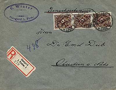 Inland cover with registeration (1-20 g) from 09.02.1923 franked with 3 stamps a 30 Mark (=90 Mark, 50 cover 40 registeration) |