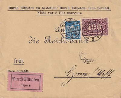 Inland cover with special delivery (1-20 g) from 23.01.1923 franked with 2 stamps(=110 Mark, 50 cover 60 special delivery)